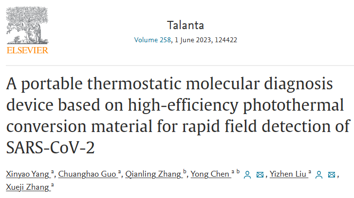 该研究成果以Short Communications的形式发表在分析化学领域著名期刊Talanta(影响因子6.556,中科院1区,TOP期刊)上,题目名为“A Portable Thermostatic Molecular Diagnosis Device based on High-efficiency Photothermal Conversion Material for Rapid Field Detection of SARS-CoV-2”的研究成果。深圳大学化学与环境工程学院21级化学创新班本科生杨欣瑶为论文第一作者,陈勇副研究员和刘翼振副教授为论文的共同通讯作者,深圳大学为第一完成单位,全文链接见:https://www.sciencedirect.com/science/article/pii/S003991402300173X