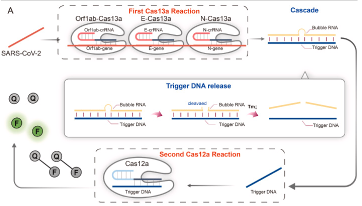 针对上述问题,深圳大学刘翼振分子诊断技术课题组在CRISPR/Cas分子诊断方向取得重要进展,提出的aM-level sensitive cascade CRISPR-Dx system(ASCas)系统是一种级联多种CRISPR/Cas酶信号放大能力的免扩增、高灵敏度(1 aM)和快速(20分钟)的SARS-CoV-2病毒的RNA检测。在ASCas系统中,高灵敏度和高转切效率的Cas13a核酸酶能够在低浓度的靶向RNA检测中迅速剪切级联探针上的RNA气泡,从而破坏级联探针并释放出大量的触发DNA,用于进一步的二级Cas12a反应信号放大。ASCas系统能快速检出aM级别的SARS-CoV-2的RNA,并且无需逆转录和预扩增。这一突破性的免扩增CRISPR-Dx技术摆脱了因扩增反应导致的气溶胶污染风险,大大降低了分子诊断的环境和人员技能要求。此外,ASCas系统通过编程设计Cas13a-crRNA来取代复杂的引物和探针筛选过程,从而可以更快速、更直观地构建适用于易突变的SARS-CoV-2等RNA病毒的检测体系。