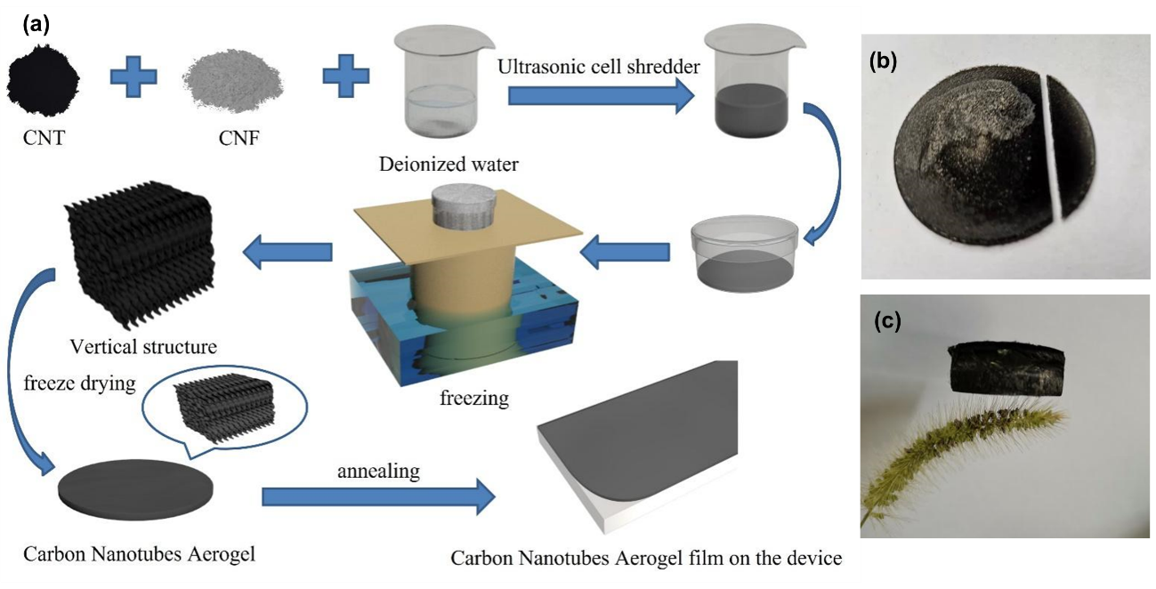 碳纳米管气凝胶(CAs)由于其超低密度和高比表面积的特性,近年来得到了广泛的应用。碳纳米管气凝胶的主要制备方法是溶胶-凝胶法,其干燥方法有常压干燥、超临界干燥和冷冻干燥,然后通过热解得到气凝胶。利用两级孔洞结构(管间孔和CNTs中空结构)在CAs中实现了超低密度。此外,由于CA的超低密度和相邻CNTs之间的高热接触电阻,使其具有超低导热性。这一特性对于减少测辐射热传感过程中的能量损失至关重要。然而,以往的工作主要集中在力学性能和保温性能方面。CA中温度依赖性电输运尚未见报道,此外,CA的测辐射热性能仍然未知。