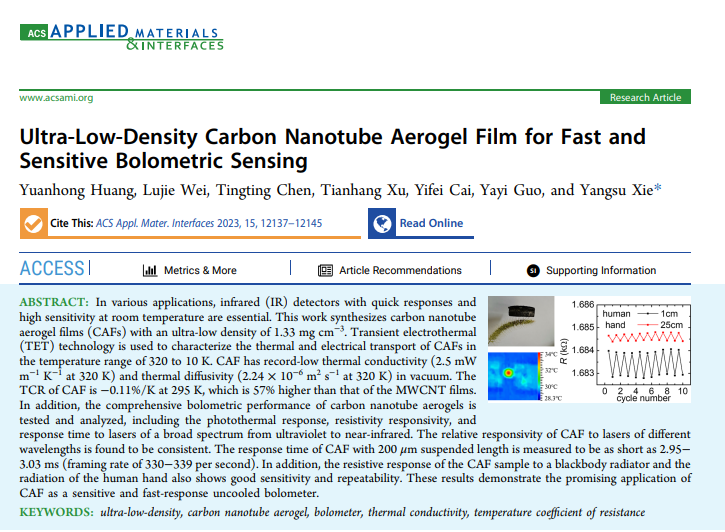 近期,深圳大学化学与环境工程学院谢杨苏特聘副研究员课题组在《ACS Applied Materials Interfaces》(影响因子10.383,中科院JCR工程技术一区,TOP期刊)上发表最新研究进展,题目为《Ultra-Low Density Carbon Nanotubes Aerogel Film for Fast and Sensitive Bolometric Sensing》。该论文第一作者为硕士研究生黄源泓,通讯作者为谢杨苏特聘副研究员,共同作者包括硕士生韦露洁、陈婷婷、胥天航,本科生蔡亦菲、郭雅仪。深圳大学化学与环境工程学院为第一完成单位和通讯单位。