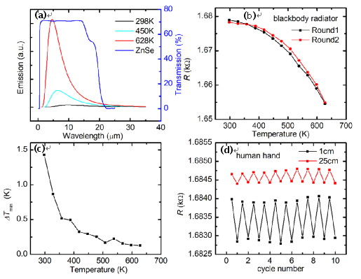 图3. (a)根据普朗克黑体辐射计算得出的黑体辐射温度分别为298、450和628 K时的波长随辐射功率分布(左轴)。ZnSe窗口的透射谱在右轴表示。(b) CAF样品在30 cm距离时对黑体辐射源温度变化的电阻响应(测量误差≤5%)。(c)距离黑体辐射源30 cm处时的最小可探测温度差。(d)距离ZnSe窗口25 cm和1 cm处对人手传感的10个电阻响应循环。
