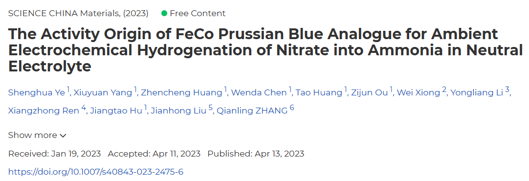 题为的《The Activity Origin of FeCo Prussian Blue Analogue for Ambient Electrochemical Hydrogenation of Nitrate into Ammonia in Neutral Electrolyte》研究性论文由叶盛华博士和硕士研究生杨秀元为第一作者,刘剑洪教授和张黔玲教授作者为通讯作者,深圳大学为第一作者单位和第一通讯单位。该论文发表于国产顶级期刊Science China Materials(影响因子8.640,中科院JCR 1区)上。