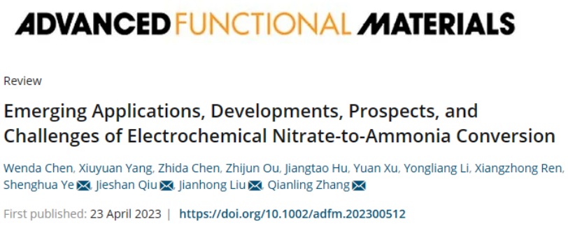 题为的《Emerging Applications, Developments, Prospects, and Challenges of Electrochemical Nitrate-to-Ammonia Conversion》综述性论文由硕士研究生陈文达为第一作者,叶盛华博士、刘剑洪教授和张黔玲教授作者为通讯作者,深圳大学为第一作者单位和第一通讯单位。该论文发表于国际顶级期刊Advanced Functional Materials(影响因子19.924,中科院JCR 1区)上。