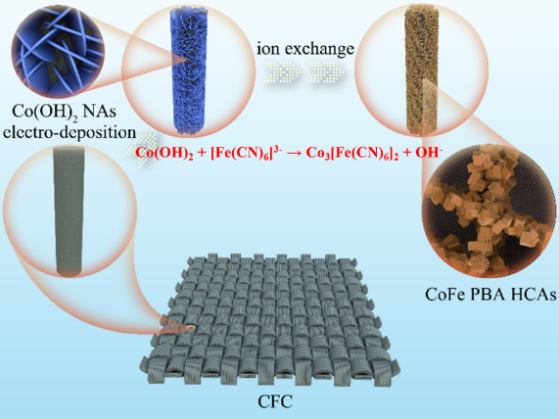 该论文报道了一种碳布负载的FeCo普鲁士蓝类似物(PBA)层状立方阵列(FeCo PBA HCAs)结构作为NO3-RR的电催化剂,并在中性磷酸盐缓冲溶液(PBS)电解质中对材料进行了产氨性能评估,结果表明,FeCo PBA HCAs表现出令人满意的产氨速率和法拉第效率。电化学和原位光谱结果表明,氰基对提高催化活性至关重要,并用前线轨道理论成功对氰基的协同效应进行了解释。