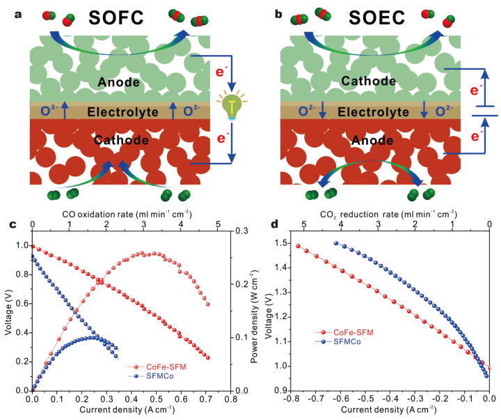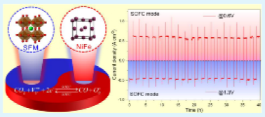 本工作提出了一种在氢气还原条件下能由双相钙钛矿Sr2Fe7/6Mo0.5Co1/3O6−δ(SFMCo)转变成Ruddlesden-Popper相钙钛矿Sr3Fe1.25Mo0.75O7−δ和CoFe合金纳米颗粒双相复合的材料,得益于这种双相的异质结构作用和CoFe合金的强催化效果,以该材料组装的单电池SFMCo/SDC//YSZ//LSM-SDC在800 oC、2:1 CO-CO2下具有259 mW cm−2的最高放电功率密度,1.3V的电压下有−0.453 A cm−2的电解电流,并且其在20次的0.6V与1.3V之间的固体氧化燃料电池(SOFC)和SOEC循环操作过程中依旧保持稳定。论文还系统的研究CO2还原和CO氧化反应动力学和确定相关速控步骤。该工作为今后设计可逆固体氧化物电池电极高效转换和利用CO2提供了指导和帮助。