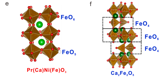 本工作通过自组装法一锅合成了名义组成为Pr0.2Ca0.8Fe0.8Ni0.2O3实际包含钙钛矿Pr(Ca)Fe(Ni)O3-δ和钙铁石Ca2Fe2O5两相材料。得益于Ca2Fe2O5丰富的氧空位浓度所带来的较强的CO2吸附能力和两相材料复合效果,该材料在800 oC下给出了高出常规钙钛矿材料一个数量级的表面化学交换系数(1.104×10−4cm−1);基于其组装的电解池Pr(Ca)Fe(Ni)O3-δ-Ca2Fe2O5//LSGM//LSCF在800 oC/1.5V的条件下获得0.648 Acm−2的电流密度,并在变温变负载模拟电解CO2测试中维持了接近300小时的稳定性。因此,自组装法为复合电极材料的设计和合成开辟了新策略。