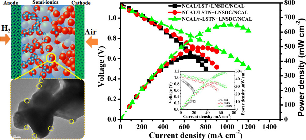 该工作利用钙钛矿材料本身氧化还原结构稳定的特点,结合表面原位溶出金属纳米颗粒构建金属-钙钛矿半导体异质结,既提升新型陶瓷电池的催化氧还原和氢氧化反应速率,又有效构建广义尺度的p-n结和肖特基结,后者有效缓解半导体“电解质”内部短路问题,并一定程度稳定单电池性能,实现高效和稳定燃料电池“一石二鸟”的效果。在该工作基础上,以课题组题硕士研究生汪增辉同学和孟元靖博士后为共同第一作者、深圳大学范梁栋为通讯作者在ACS Applied Materials & Interfaces(影响因子10.383)上发表题为《Ni/NiO exsolved perovskite La0.2Sr0.7Ti0.9Ni0.1O3−δ for semiconductor-ionic fuel cells: Roles of electrocatalytic activity and physical junctions》的研究性论文,深圳大学为第一作者单位和唯一通讯单位。该工作在阳极添加功能催化层,联合可行的钙钛矿表面溶出和功能催化能还原分别从微观和宏观(体)尺度构建了金属-钙钛矿半导体异质结,显著提升电极催化性能和电荷分离效率,相应半导体离子燃料电池的最大功率密度相比未修饰电池提升一个数量级以上。上述工作为新型电池的效率和稳定操作以及理解其相应工作原理提供方法借鉴和参考。