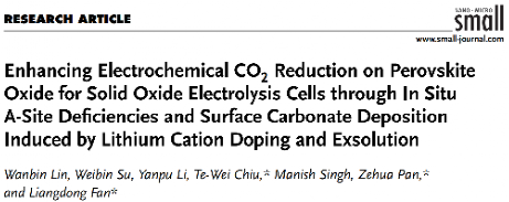 随着现代社会的快速发展,人类对于能源的需求日益增加,传统燃料的过度使用造成了大量温室气体二氧化碳(CO2)的排放,太阳能、风能等新能源又因为其不稳定性等问题限制着其有效利用。利用新能源的多余电量将CO2转化为其他可燃类气体,如一氧化碳或者碳氢燃料气体,是充分利用新能源和节能减排的有效方案。固态氧化物电解池(SOECs)由于其高效的转化效率和有利的热动力学条件,受到许多研究工作者的关注并将它们应用在CO2的电解中。题为《Enhancing Electrochemical CO2 Reduction on Perovskite Oxide for Solid Oxide Electrolysis Cells through In Situ A-Site Deficiencies and Surface Carbonate Deposition Induced by Lithium Cation Doping and Exsolution》的研究性论文由硕士研究生林万斌为第一作者,深圳大学范梁栋、台北科技大学Te-Wei Chiu与哈尔滨工业大学(深圳)潘泽华为共同通讯作者合著。深圳大学为第一作者单位和第一通讯单位。该论文近期发表于国际期刊Small(影响因子15.153,中科院大类 1区)上。
