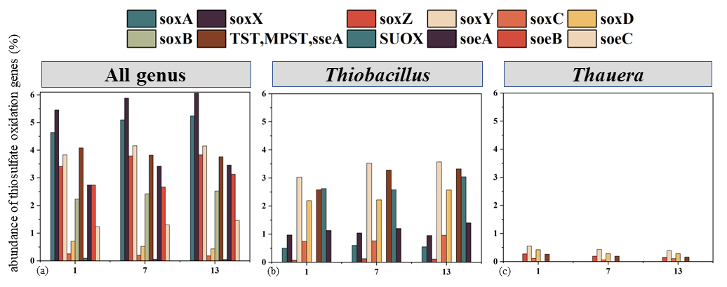 图4 基于功能基因鉴定的(a)All genus,(b)Thiobacillus和(c)Thauera的硫代硫酸盐氧化途径的基因丰度