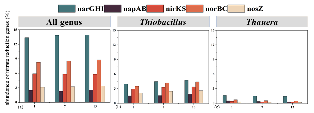 图5 基于功能基因鉴定的(a)All genus,(b)Thiobacillus和(c)Thauera的硝酸盐还原途径的基因丰度