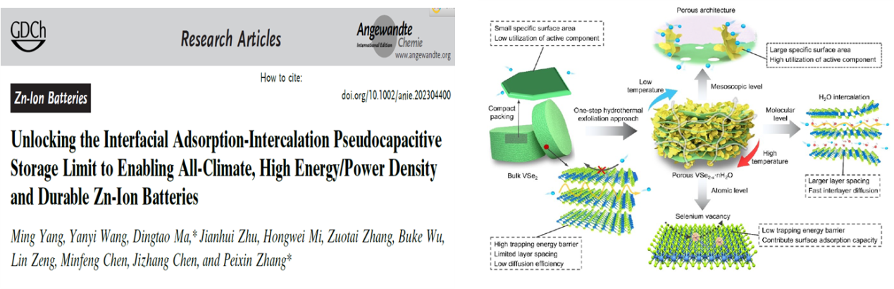 2. 为解决用于锌离子存储的过渡金属硫族化合物(TMDs) 存储动力学缓慢和性能差等问题,提出了一种多尺度界面结构集成调制概念,以解锁全方位存储动力学增强的多孔VSe2-x·nH2O宿主,同时还发现了一种界面吸附-插层赝电容存储机制。这项工作实现了概念上的突破,扩展了层状TMDs的界面存储极限,以构建全天候高性能锌离子电池。该成果发表在《Angewandte Chemie International Edition》(2023,62:e202304400)。深圳大学为第一完成单位和唯一通讯单位,博士研究生杨明为论文第一作者,张培新教授和马定涛副研究员为共同通讯作者。论文链接:https://doi.org/10.1002 / anie.202304400