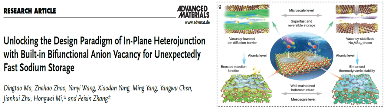 1. 为解决过渡金属化合物作为钠离子电池负极材料容量低和循环性能差等问题,提出了一种独特的原位功能化和自限生长方法,以V2CTxMXene为模板,设计了具有内嵌阴离子空位的VSe2-x/C面内异质结,在加硒过程中,V2CTx的碳原子层转化为超薄的导电碳,最大限度地与生成的VSe2组分面对面接触。同时,碳还原环境的自发形成削弱了V-Se键,产生了丰富的Se阴离子空位结构,双功能阴离子空位与面内异质结构之间存在多尺度的界面协同作用,缓解了体积应变,提高了Na+插层和后续转化反应的动力学和热力学。该成果发表在《Advanced Materials》(2023:2310336),深圳大学为第一完成单位和唯一通讯单位,马定涛副研究员和研究生赵哲浩为论文共同第一作者,张培新教授和米宏伟副教授为共同通讯作者。论文链接:https://doi:10.1002/adma.202310336