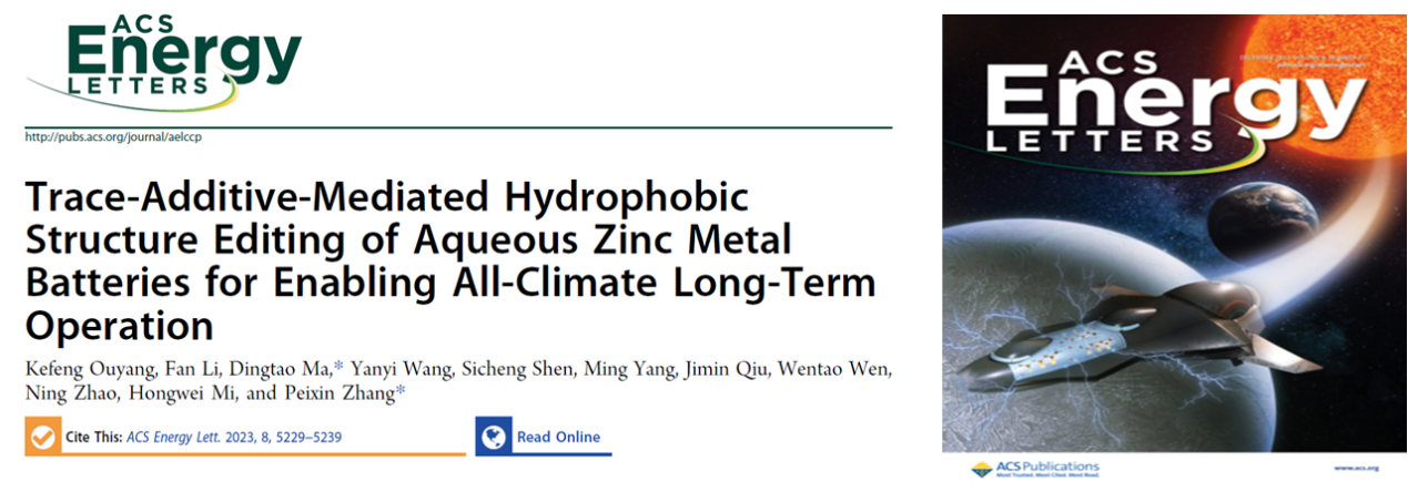4. 为解决Zn2+传输动力学缓慢和电解质界面热力学不稳定等问题,提出了痕量添加剂介导的疏水结构编辑概念,通过向水系电解液中添加聚丙烯酸(PAA)来重建电解液Zn2+溶剂化结构并实现电极-电解液界面原位自组装。重构的Zn2+水合结构具有快速的电化学反应动力学,而电极表面界面层极大提高了水系锌金属电池体系的热力学稳定性,从而实现了宽温域的长期运行。该成果作为封面文章发表在《ACS Energy Letters 》(2023,8:5229)。深圳大学为第一完成单位和唯一通讯单位,研究生欧阳珂丰和李帆为论文第一作者,张培新教授和马定涛副研究员为共同通讯作者。论文链接:http://10.1021/acsenergylett.3c01872