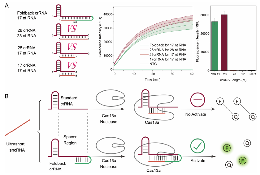 小非编码RNA (Small noncoding RNA, sncRNA)是生命活动的重要调控因子,在基因表达调控、生物发育、代谢和疾病中发挥着重要作用。然而,目前许多现有检测方法对<22个核苷酸(nt)的超短sncRNA的检测特异性较差。CRISPR/Cas13a系统是一种很有前景的核酸检测技术,可在不受基因组DNA干扰的情况下直接检测sncRNA。目前的报告表明,标准CRISPR/Cas13a系统检测28 nt 靶标RNA时可在20分钟内迅速产生强烈的荧光信号,然而检测超短靶标RNA时的检测性能急剧下降。