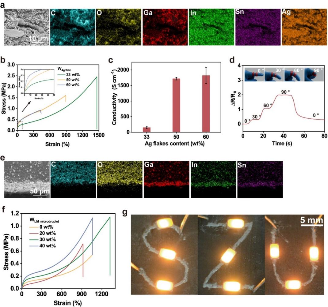 图2.(a-d)以银微米片为导电填料的复合材料的制备与应用;(e-h)以液态金属微米液滴为导电填料的复合材料的制备与应用。