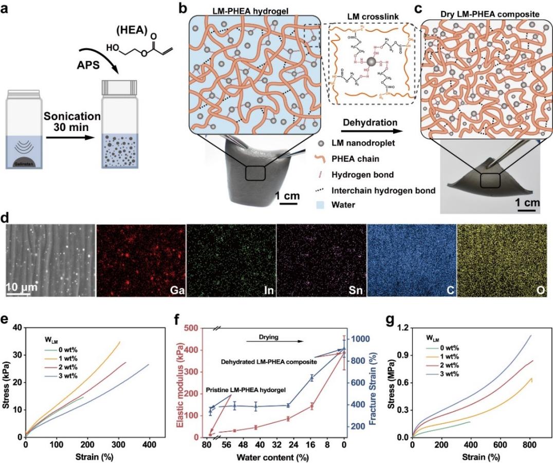 液态金属纳米液滴与引发剂过硫酸铵(APS)协同引发单体2-羟乙基丙烯酸酯(HEA)的聚合,实现在2 min内快速凝胶化,形成聚合物液态金属复合水凝胶(图1a-d)。其中,液态金属纳米液滴通过表面的氧化物与聚合物链形成氢键,能够作为一种物理交联点增强凝胶的机械性能(图1e)。经过干燥处理后,复合材料的机械性能大幅增强,弹性模量和断裂应变从最初的12.7 kPa和340%分别提高到388 kPa和913%(图1f-g)。