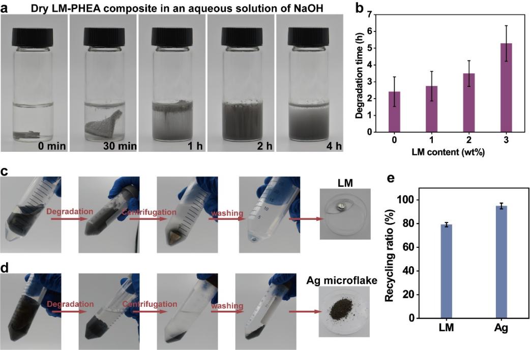 由于液态金属纳米液滴作为物理交联点,当将复合材料浸没于氢氧化钠(NaOH)水溶液中,液态金属纳米液滴的氧化层会与NaOH反应,破坏了纳米液滴与聚合物链间的氢键,从而破坏该复合材料的交联网络。因此,这些复合材料可以在NaOH水溶液中完全溶解(图3)。而且,其中的导电填料可以分离出来,并且回收利用。液态金属和银微米片的回收率可分别达到79%和95%。