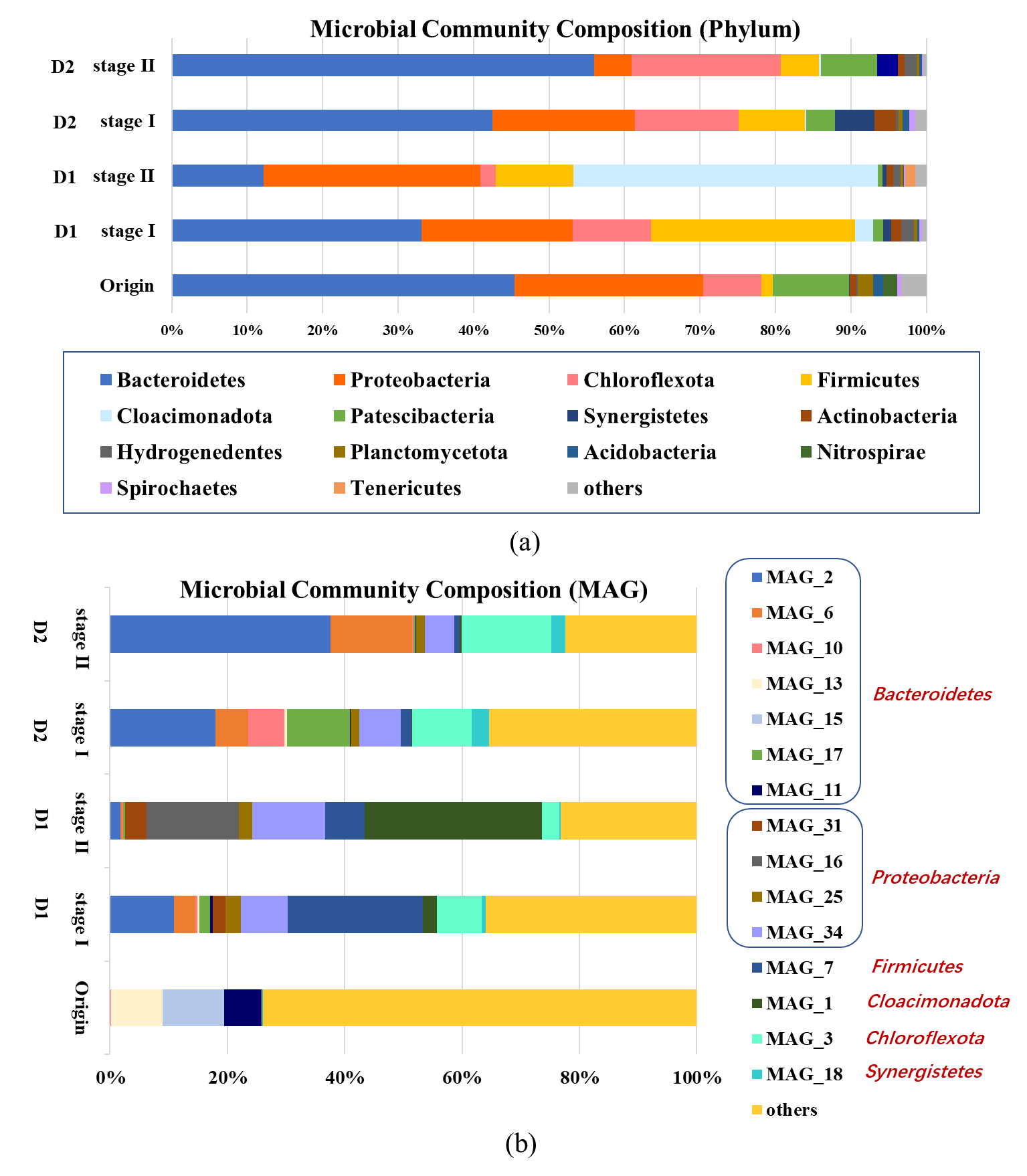 图3 (a)丰度前15%物种在门水平上的相对丰度;(b)丰度前15%的MAG(D1:甲酸盐进料;D2:乙酸盐进料)