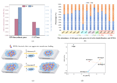 图4 (a)EPS生物合成基因和CAZYmes相关基因的丰度;(b)参与反硝化和DNRA的氮循环基因的百分比;(c)随着C/N比的增加,甲酸盐和乙酸盐对可加重膜污染的DNRA细菌的变化;(d)细菌群落的PCA分析(D1:甲酸盐进料;D2:乙酸盐进料)。