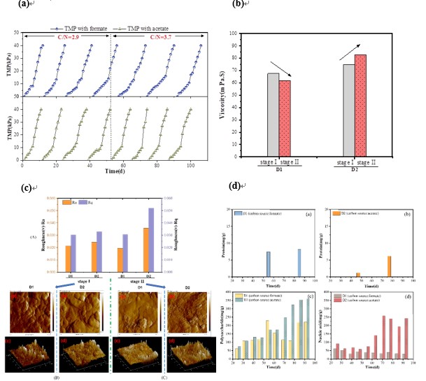 图2 (a)AnMBR在操作过程中的TMP变化;(b)污泥粘度变化;(c)膜表面的AFM表征;(d)EPS浓度变化(D1:甲酸盐进料;D2:乙酸盐进料)