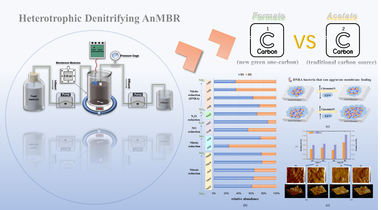 异养反硝化已被用于处理化肥、炸药和金属精加工部门产生的含硝酸盐废水。为驱动异养反硝化而应用的传统碳源,不仅成本高昂,而且可能在无意中导致运营中产生的二氧化碳。寻找新的绿色碳源是有必要的。甲酸盐(一种单碳分子)最近在绿色化学和环境工程领域都受到了关注。甲酸盐被设想为碳中和生物经济的核心。电化学CO2气体固定是碳中性甲酸盐合成的一种有前途的方法。目前,甲酸盐在废水处理中的应用已有文献记载。然而,它并不是许多细菌的理想碳源和能源。目前,甲酸盐在驱动异养反硝化中的应用在文献中仍未得到充分探索。从可持续废水处理的角度来看,厌氧膜生物反应器(AnMBR)在废水处理方面比传统的活性污泥工艺具有明显的优势。在为AnMBR开发的多种膜类型中,平板膜组件因其占地面积小、膜更换方便和高效处理而受到关注。然而,AnMBR并非没有挑战。膜污染以孔隙堵塞和滤饼层形成为特征,阻碍了AnMBR的广泛采用。