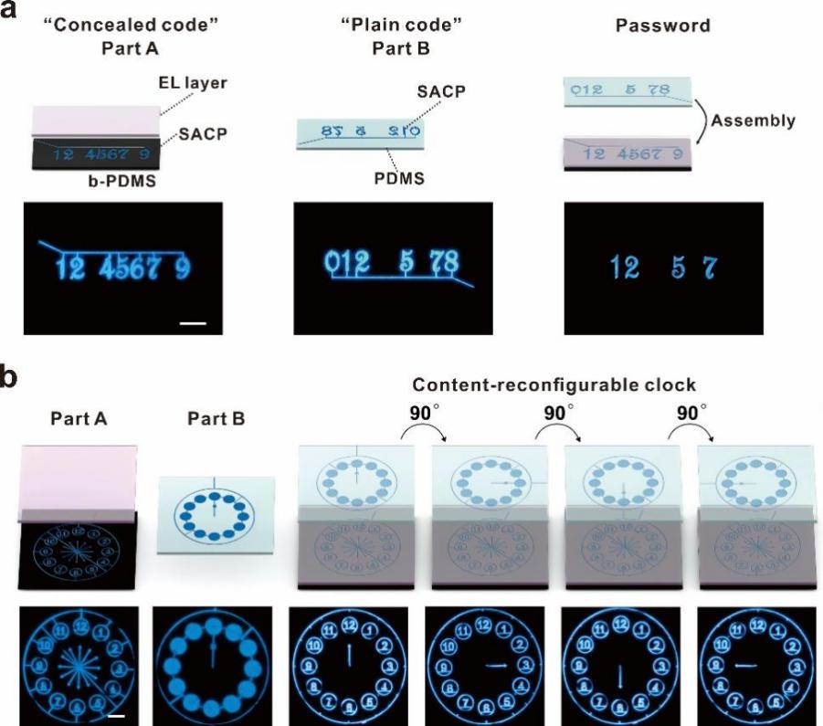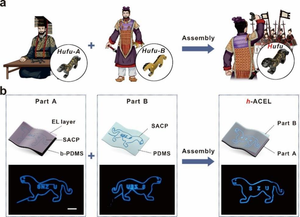 “虎符”作为古代中国皇权的象征,由两个虎形符印组成,调兵时需要两半合对铭文才能生效(图1a)。受到这个概念的启发,研究团队将传统的一体化器件拆分成包含透明电极/电致发光层(A部分)和透明电极(B部分)的两个部分。得益于SACP材料的柔性和粘性,两部分贴合时能形成稳定可靠的界面,成为一个完整的器件。如果将两部分的SACP电极分别图案化,通电后显示的图案将会是两部分图案重合的部分(图1b)。