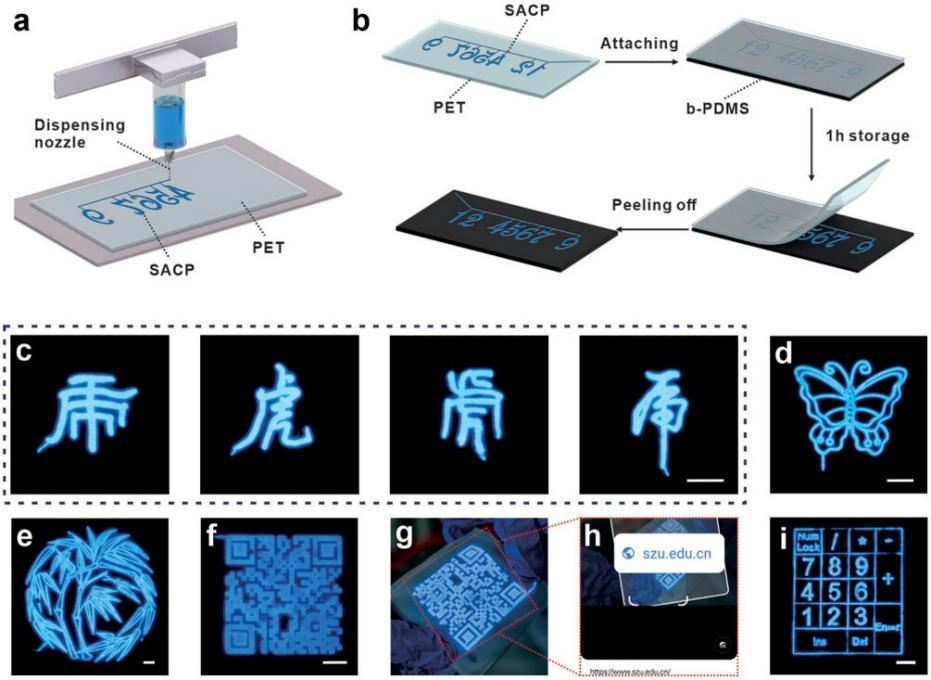 图2、印刷SACP电极的示意图(a, b),以及图案化的交流电致发光器件(c-i)。