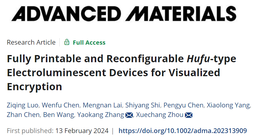 Z. Luo, W. Chen, M. Lai, S. Shi, P. Chen, X. Yang, Z. Chen, B. Wang, Y. Zhang*, X. C. Zhou* Fully Printable and Reconfigurable Hufu-type Electroluminescent Devices for Visualized Encryption. Adv. Mater. 2024, 2313909. https://doi.org/10.1002/adma.202313909