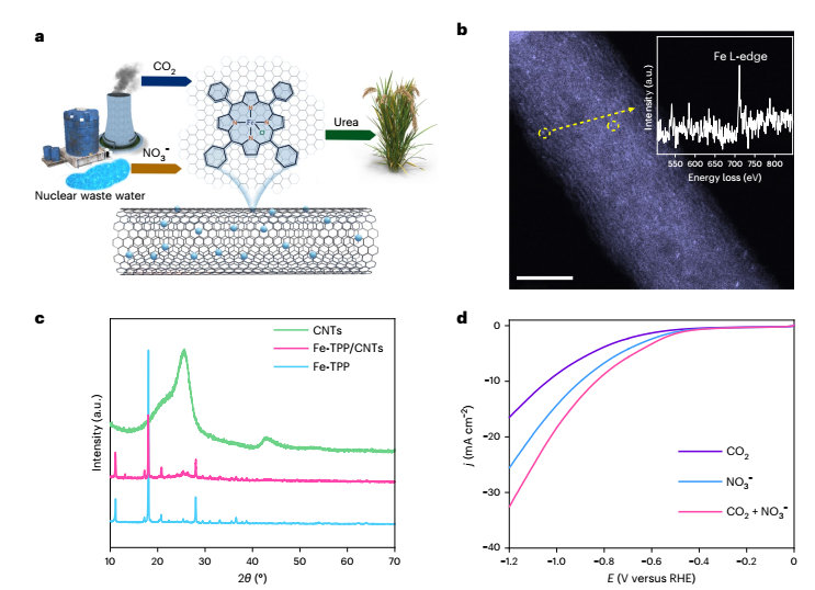 尿素作为一种重要的氮肥,它在粮食增产中发挥着至关重要的作用。目前,工业上大规模生产的尿素的工艺仍然是Bosch-Meiser法,其具体过程为在高温(~200 ℃)高压(~210 bar)的条件下,将CO2和液态NH3转化为尿素,这个过程不仅耗能高而且还需要昂贵的液态NH3作为反应物。因此,开发耗能低的尿素合成路线具有重要的意义。目前,电催化NO3−和CO2的共还原反应为尿素可持续生产提供了有前景的路线,但是该路线存在着尿素产率低的瓶颈问题。