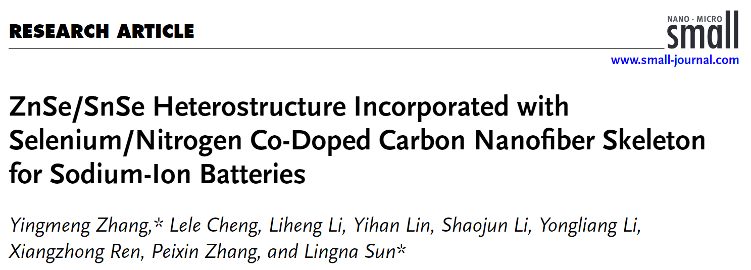 为解决金属硫族化合物作为钠离子电池负极材料时,在转化-合金化过程中伴随着的体积膨胀变形和活性材料粉化导致电极接触减弱,从集电器上剥落等问题,孙灵娜教授团队首先将ZnSn(OH)6纳米盒状前驱体与聚丙烯腈(PAN)进行静电纺丝,得到三维自支撑网络,经过碳化和硒化热处理后,开发出嵌入Se/N共掺杂CNF骨架中的ZnSe/SnSe异质结构(ZnSe/SnSe@Se,N-CNFs)。独特的ZnSe/SnSe异质结构、静电纺丝CNF和Se/N共掺杂特性可有效促进电子/离子传输速率,提高结构稳定性,加速电化学反应动力学:I) ZnSe/SnSe中的异质边界将提供增强的界面耦合效应和内置电场,具有额外的电荷转移驱动力,可吸引更多Na+离子吸附在异质界面上,提高Na+离子从电解液到电极的迁移速率,从而有效加速电化学反应动力学。Ⅱ) 嵌入ZnSe/SnSe纳米盒的三维自支撑CNF网络不仅能增强半导体ZnSe/SnSe的导电性,还能避免在嵌入/脱出过程中发生剧烈的体积膨胀/收缩,改善其结构的完整性。Ⅲ) Se/N共掺杂特性实现了CNF基体与硒化异质结构之间的耦合效应,实现了离子/电子的快速传输,加速了钠离子储存的表面/内部反应动力学,并增强了CNF基体的电子导电性和电解液润湿性。这项研究为解决目前合金基材料在钠离子电池中所面临的挑战提供了一些具有启发性的设计思路:通过异质纳米结构构建、碳壳涂层和共掺杂改性策略,提高了导电性;通过将合金材料嵌入具有三维独立骨架特征的碳基体,解决了体积膨胀问题。该论文《ZnSe/SnSe Heterostructure Incorporated with Selenium/Nitrogen Co-Doped Carbon Nanofiber Skeleton for Sodium-Ion Batteries》发表在《Small》(影响因子13.3,中科院JCR 2 区),深圳大学化学与环境工程学院张颖朦研究员、硕士研究生程乐乐为共同第一作者,张颖朦研究员、孙灵娜教授为共同通讯作者,深圳大学化学与环境工程学院为通讯单位。