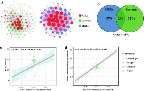 图3 水产养殖系统中ARGs的影响因素。a:网络分析显示ARGs、可移动遗传原件(MGEs)与细菌(属水平)之间存在相关性。节点越大,表示相关连接越多。红线表示正相关,绿线表示负相关。b: VPA显示了MGEs和细菌对ARGs变化的解释率。c: ARGs丰度与MGEs数量呈线性关系。d: ARGs丰度与MGEs丰度呈线性关系。
