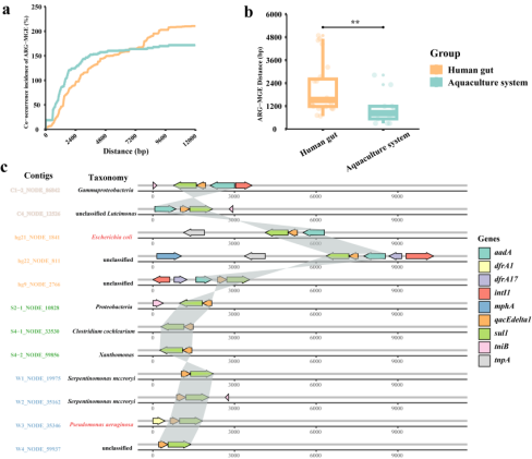 图4 ARGs和MGE共现模式。a: ARGs与MGE共现率。x轴表示ARG-MGE的距离,y轴表示共现率。随着距离的增加,共现率也随之增加,并逐渐达到峰值。b: ARG-MGE在人肠道和水产养殖系统中的最短距离。c: ARGs在不同样本中的基因排列模式。红色的细菌分类名称表示致病菌。