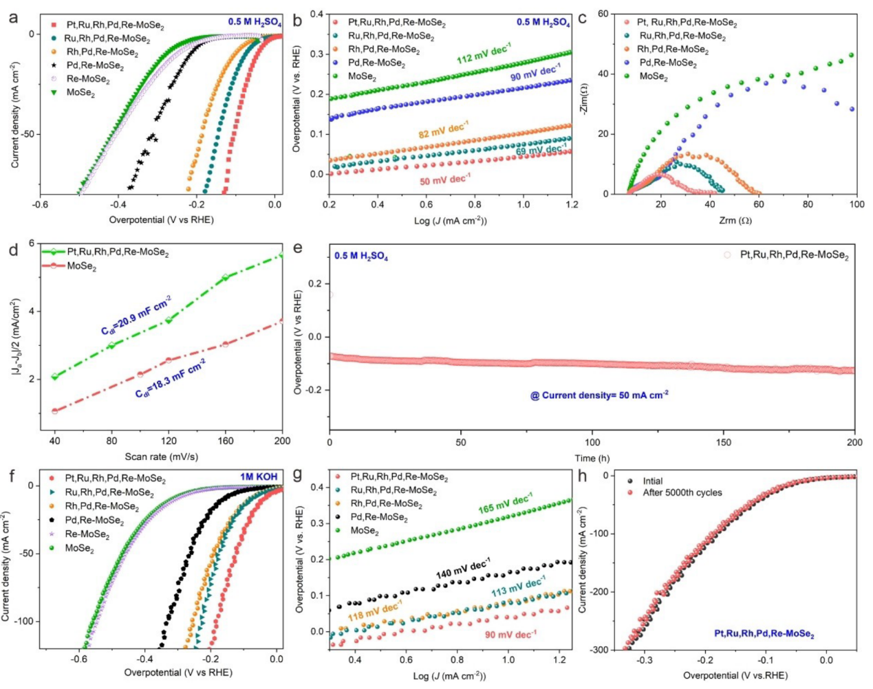 在本研究中,作者通过一种衬底介导的SAs形成策略,成功地在MoS2和MoSe2载体上制备了多金属SAs和HESAs的文库,可以精确地控制SAS的掺杂位置。特别是,SAs的含量可以不断增加,直到TMDS载体上可达的Mo原子完全被SAs取代,从而允许更高的金属含量。深入的机理研究表明,通过控制TMDS/TM离子界面上发生的可逆氧化还原反应,实现了多金属SAS和HESA的良好控制合成。作为概念验证的应用,各种SAs-TMDs被应用于析氢反应。优化的HESA-TMDs(Pt、Ru、Rh、Pd、Re-MoSe2)比最先进的铂具有更高的活性和耐用性。因此,本研究工作将拓宽单原子催化剂的家族,为合理设计高性能的单原子催化剂提供新的指导。