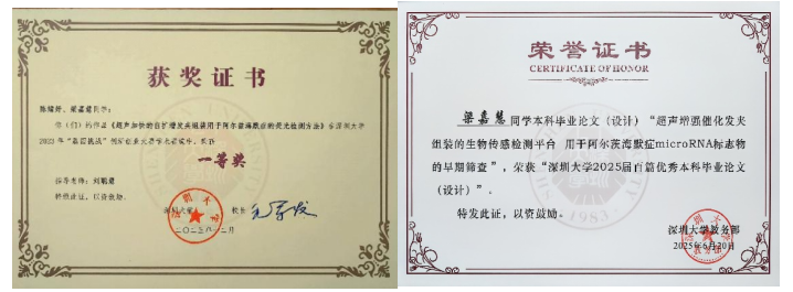 3. 深大-北科大联培博士生罗勇与我院21级化学专业本科生梁嘉慧、陈婧妤一起,以共同第一作者身份在在中科院一区TOP期刊Biosensors and Bioelectronics上发表题为“Ultrasound-enhanced catalytic hairpin assembly capable of ultrasensitive microRNA biosensing for the early screening of Alzheimer’s disease”的研究论文。该研究得到了广东大学生科技创新培育专项资金支持,获得了深圳大学大学生创新创业训练计划项目(省级)优秀结题、深圳大学2023“荔园挑战”创新创业大赛学术赛道一等奖以及深圳大学2025届百篇优秀本科毕业论文(设计)。21级化学专业本科生梁嘉慧、陈婧妤均获得院荣誉学士学位,并分别获得深圳大学、西湖大学的直博资格。