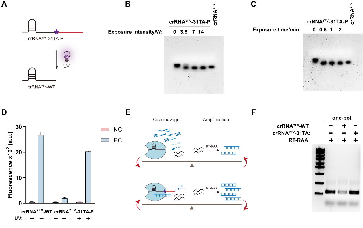 本研究开发了一种通用光控CRISPR/Cas12a一锅法检测平台,通过在crRNA 3’末端引入光可切割(PC)DNA linker修饰,实现了虫媒病毒的快速、高灵敏度检测,整个流程可在30分钟内完成。 临床样本检测结果证实,该平台对12份虫媒病毒样本(6份黄热病毒阳性、6份阴性对照)的检测结果与RT-qPCR 100%吻合,且能精准区分黄热病毒与寨卡、登革等其他蚊媒病毒。
