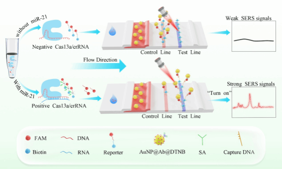 miRNA是一类短的内源性非编码RNA分子,其中miR-21作为一种与众多癌症密切相关的生物标志物,其检测为癌症的早期诊断提供了可能。然而,miRNA的检测面临诸多挑战,例如体液(血液、唾液等)中浓度低、易受同源异构体及序列相似性干扰、易降解导致回收率低、PCR检测中引物设计复杂等难题。本研究提出了一种将CRISPR/Cas13a系统与侧流生物传感器相结合的策略,可在室温下实现miRNA的无扩增定量检测。我们对该方法的反应原理和侧流试纸条结构进行了精心设计,实现了靶标miRNA在试纸条测试线产生表面增强拉曼散射(SERS)/比色双信号“关闭-开启”响应。