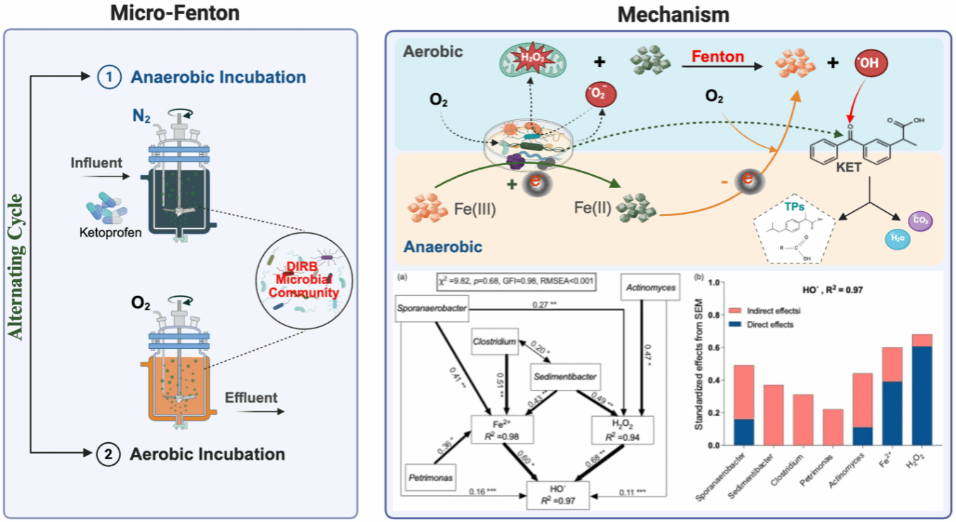 这项研究首次证实,利用天然富集的兼性厌氧铁还原菌群,可在构建“自维持微生物芬顿系统”,实现近中性环境中药物类新污染物的高效降解。其核心优势在于突破酸性限制,无需pH调节,广泛适应自然水体环境;通过微生物群落代谢协同实现 Fe2+ 和H2O2的原位持续产生,降低能耗与化学试剂消耗。这项技术不仅为制药废水治理提供了新方案,还加深了对水环境“微生物—铁氧化还原循环—污染物降解”耦合机制的理解,为开发更多低碳环境修复技术奠定基础。