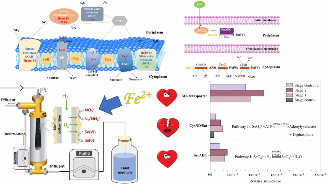 氢基膜生物膜反应器(H2-MBfR)以氢气作为清洁电子供体,具有“无有机残留、低污泥产量、可还原多种氧化态污染物”等优势,但其协同还原性能对体系中痕量元素与生物膜电子传递过程高度敏感,尤其在硒酸盐(SeO42-)与硝酸盐(NO3-)共存时,如何通过营养条件实现稳定高效的同步还原仍缺乏机制阐释。本研究构建实验室尺度H2-MBfR,在进水 NO3-为 5 mg N/L、SeO42-为0.5 mg Se/L 条件下,采用分阶段Fe2+投加策略(0.2→1→5 mg/L,随后降回 0.2 mg/L)系统评估其调控效应。结果表明,随着Fe2+浓度由 0.2 mg/L 提高至 5 mg/L,SeO₄²⁻的还原效率由86%显著提升至接近100%,而NO3-去除率始终保持在95%以上;当Fe2+恢复至0.2 mg/L 后,SeO42-去除下降至约60%,验证了Fe2+对Se(VI)还原强化具有可逆性与决定性贡献。宏基因组分析显示,高Fe2+显著重塑群落结构:携带反硝化与 Se(VI) 还原关键基因的Dechloromonas富集并成为优势菌属(相对丰度达25.8%),同时Acidovorax与Azonexus等自养反硝化菌随Fe2+升高而增加;在功能基因层面,Fe2+投加促进与NO3-还原及Se(VI)还原相关的关键酶基因上调/富集,尤其是SerABC与Mo-transporter gene的增强与NO3-去除提升高度一致。机制上,Fe2+通过支撑Fe-S簇与血红素等金属辅因子形成、强化呼吸链与界面电子传递/缓冲能力,从而“收紧”H2相—生物膜—终端电子受体之间的耦合,提高电子向 SerABC 等还原模块的有效分配,最终实现NO3-与SeO42-的协同高效同步还原。本研究从“性能—群落—功能基因—机制”多层面揭示了Fe2+ 补充强化H2-MBfR协同去除含氧阴离子污染物的内在规律,为地下水等低碳生物修复工艺的营养调控与过程优化提供了理论依据。
