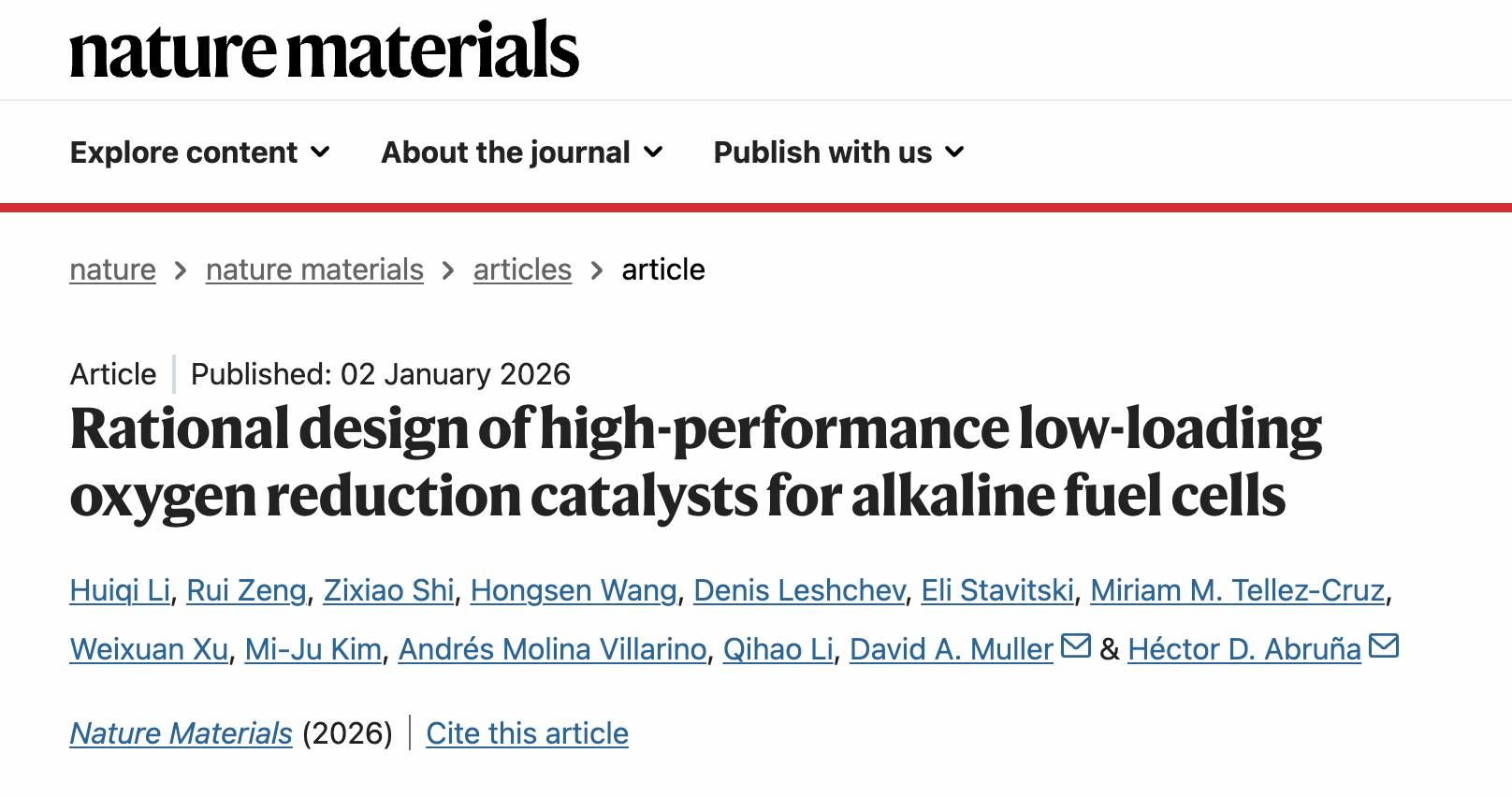 近日,我校化学与环境工程学院李慧齐助理教授(张雷特聘教授团队)与美国康奈尔大学Héctor D. Abruña院士团队合作,在阴离子交换膜燃料电池(AEMFCs)催化剂设计领域取得重要突破。相关成果以“Rational design of high-performance low-loading oxygen reduction catalysts for alkaline fuel cells”为题发表于《Nature Materials》期刊上。李慧齐助理教授为论文第一作者,深圳大学为第二单位。