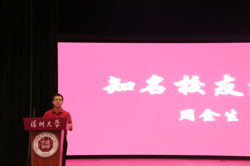 2005级的周金生校友表示自己作为一个深大培养和塑造的人,在深圳大学学习工作了十几年,本科、硕士的学业是在深大完成的,博士的科研也是借着深大的平台完成,在这里收获了知识、能力、友谊、爱情。他认为深圳大学的特色便是继承了国内大学的优良传统和学风,又带着天然的改革创新基因,作为一所特区大学、窗口大学、实验大学,深圳大学在多个方面展现出卓越的特点。他向大家分享了自己的求学之路和工作经验,并以一位师兄的身份从学习、生活、心理、工作等各个方面给新生提出了恳切的建议。