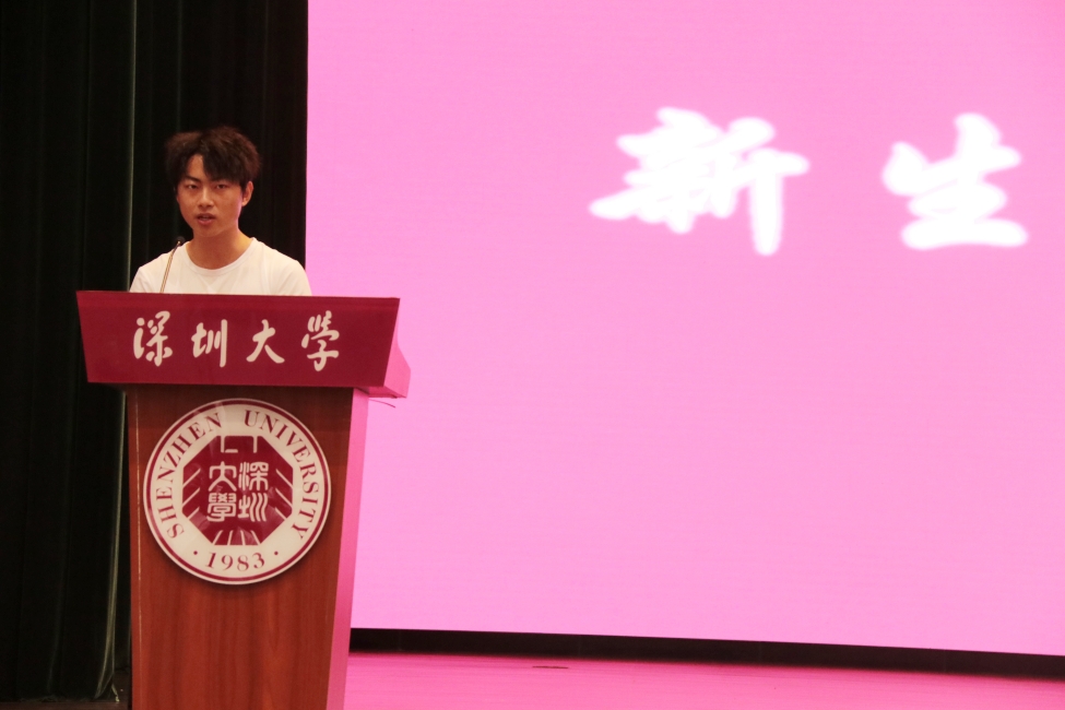 官翊楠同学代表全体新生,向给予大家关心的师长和亲友道谢。他表示深圳大学是他一直向往的梦想,很开心也很骄傲成为深大的一份子,并在这里大家将展开属于自己的青春探险。他告诫大家在留下美好回忆的同时不要忘了主线任务——学。大学可能会让同学们感到迷茫,然而正是在迷茫中的探索,再加上彷徨中的前进,大家才能找到属于自己的道路,祝愿大家都能在深大实现青春梦想。