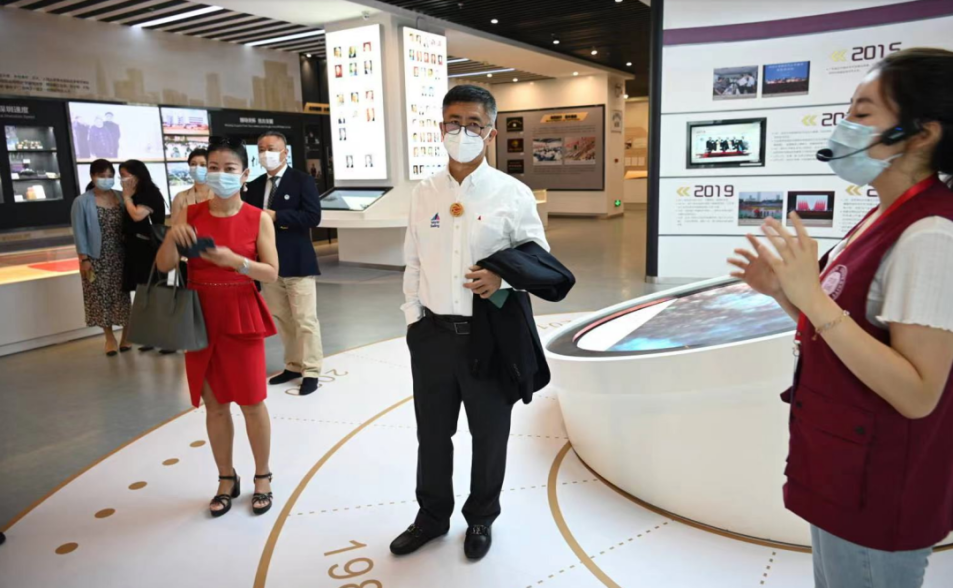 李全海先生一行先到校史馆参观,了解学校的发展历程。他在深大运动训练专业校友、中国帆板运动员陈佩娜的图片前驻足,为深大近些年的快速发展感到惊叹不已。
