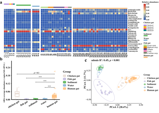 图1 各样品ARGs组成及丰度分布图。a: ARGs相对丰度热图。顶部不同的色块代表不同的样本类型。b:不同样本ARGs丰度箱形图。组间差异以星号表示。c: PCoA显示了基于ARGs丰度的不同样本之间的聚类差异。
