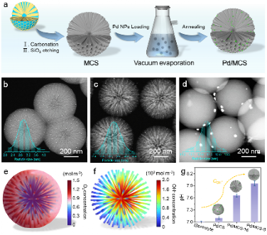 在本工作中,何传新教授团队采用优化的介孔碳载体来负载Pd纳米颗粒(Pd/MCS),实现了高达95%的H2O2选择性,并在流动池设备中H2O2产率达到15.77 mol gcatalyst-1 h-1。有限元模拟和实验结果表明,介孔碳载体促进了O2富集和局部pH值的升高,为中性条件下的2e- ORR创造了有利的反应微环境。理论计算和表征结果表明,Pd纳米粒子与碳载体之间的相互作用优化了碳边缘对*OOH中间体的吸附能,确保了催化反应沿着高活性和高选择性的两电子途径进行。该工作为中性H2O2溶液的高效电合成催化剂提供了新的见解,强调了载体工程在构建有利的微环境和协同活性位点方面的作用。