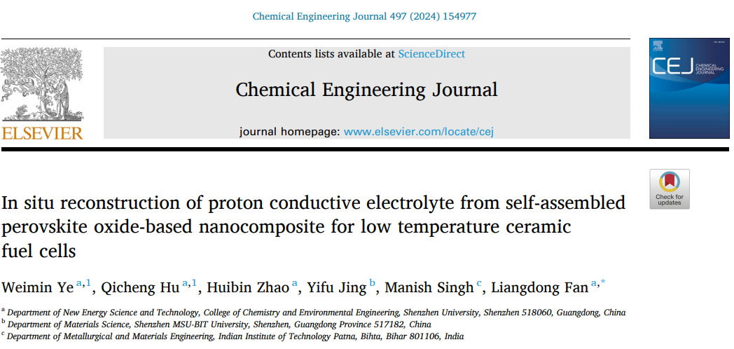 深圳大学化学与环境工程学院范梁栋副教授团队在《Chemical Engineering Journal》(中科院大类一区,TOP期刊)上发表了题为“In situ reconstruction of proton conductive electrolyte from self-assembled perovskite oxide-based nanocomposite for low temperature ceramic fuel cells”的研究论文。全文链接:https://doi.org/10.1016/j.cej.2024.154977。硕士研究生叶为民和实验员胡启铖为论文共同第一作者,范梁栋副教授为论文唯一通讯作者,深圳大学为第一和唯一通讯单位。