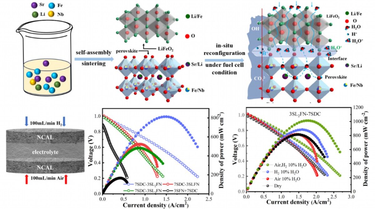 亮点二:SOFC的关键材料LiFeO2+SFN在燃料电池气氛下原位重构产生LiFeO2+SFN+碳酸盐的微纳异质结构电解质,丰富的异质界面、界面缺陷和增强水合能力显著地提升离子导电性到0.185S/cm;LT-SOFC单电池峰值功率密度达到1012 mW/cm2(550oC)。