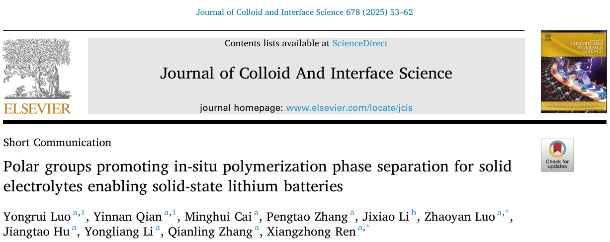 深圳大学化学与环境工程学院任祥忠教授团队在国际能源领域著名期刊《Journal of Colloid And Interface Science》(影响因子9.4,中科院JCR1区,TOP期刊)上发表了题为《Polar groups promoting in-situ polymerization phase separation for solid electrolytes enabling solid-state lithium batteries》的论文。该团队硕士生罗永睿和博士生钱音男为共同第一作者,任祥忠教授和罗兆艳助理教授为共同通讯作者,深圳大学为唯一通讯单位。