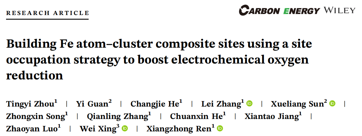 深圳大学化学与环境工程学院任祥忠教授团队在材料领域顶尖期刊《Carbon Energy》(影响因子19.5,中科院JCR 1区)发表了题为《Building Fe atom-cluster composite sites using a site occupation strategy to boost electrochemical oxygen reduction》的研究论文。该团队硕士研究生周廷仪为论文第一作者,深圳大学任祥忠教授和罗兆艳助理教授,中国科学院长春应化所邢巍教授为该论文共同通讯作者,深圳大学为第一作者单位和第一通讯单位。
