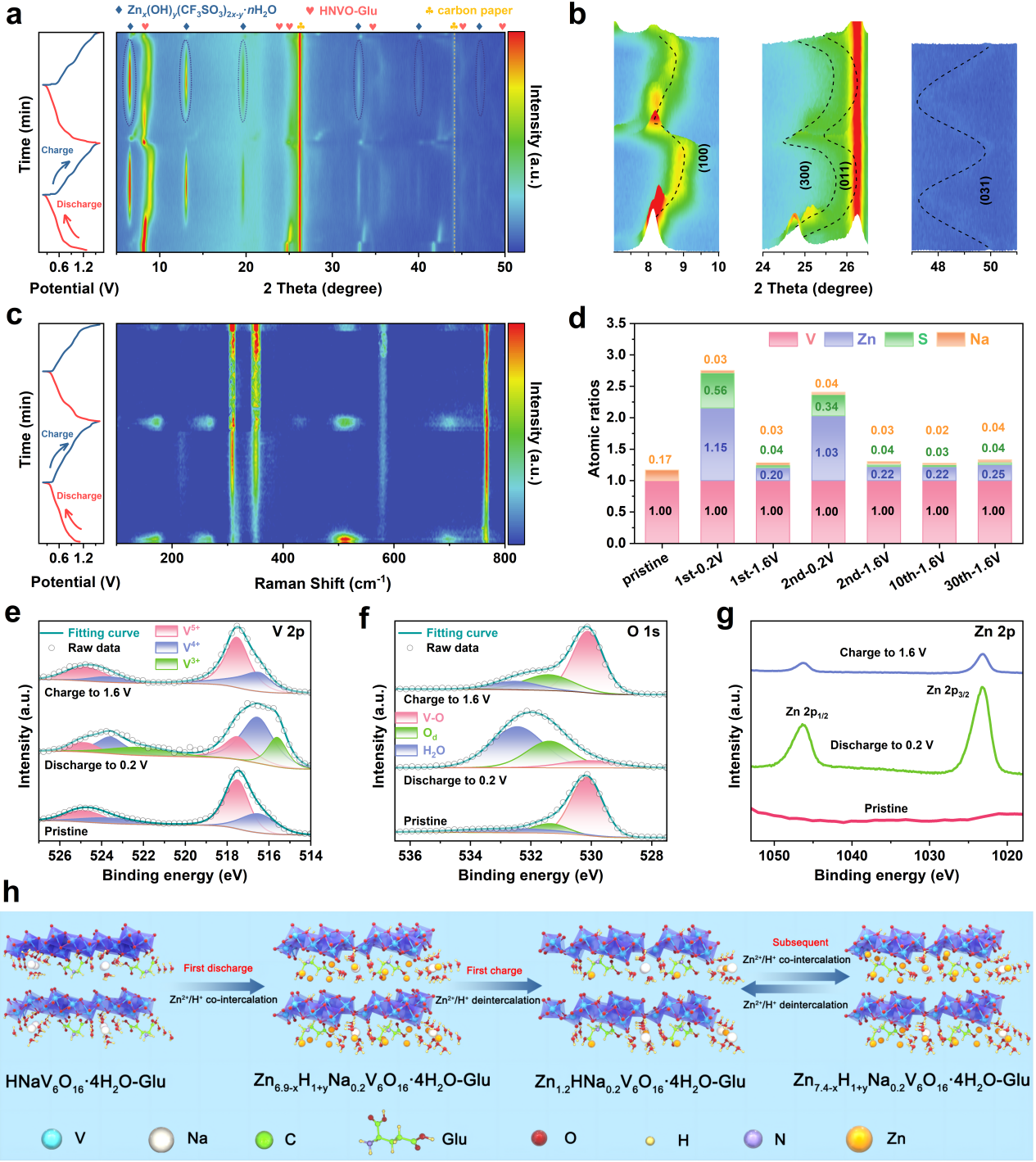 在本研究中,我们通过客体材料介导的NVO合成策略,利用谷氨酸(Glu)诱导质子取代 Na,实现 Na2V6O16·3H2O (NVO)的晶体转变,从而探索出一种有机-无机混合正极 HNaV6O16·4H2O-Glu(HNVO-Glu)。其中,通过Glu可以将H引入NVO 框架中,诱导形成结构更稳定的单斜HNaV6O16·4H2O相,防止结构相变和V6O16层状结构材料坍塌;同时Glu作为支柱扩大层间距,提升 Zn2+扩散动力学;此外,Glu表面的极性基团削弱了Zn2+与宿主材料之间的静电作用,进一步提高了Zn2+迁移速率;理论计算表明Glu的引入可以将原始的p型半导体转化为n型半导体结构,提高了HNVO正极的导电性。该研究为未来合理设计具有有机-无机杂化结构的先进水系锌电正极提供了潜在的见解。
