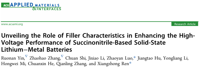 深圳大学化学与环境工程学院任祥忠教授团队在期刊《ACS Applied Materials & Interfaces》(影响因子8.3,中科院JCR2区,TOP期刊)上发表了题为《Unveiling the Role of Filler Characteristics in Enhancing High-Voltage Performance of Succinonitrile-Based Solid-State Lithium Metal Batteries》的论文。该团队硕士研究生尹若男和张兆昊为共同第一作者,任祥忠教授和罗兆艳助理教授为共同通讯作者。深圳大学为唯一作者单位和唯一通讯单位。